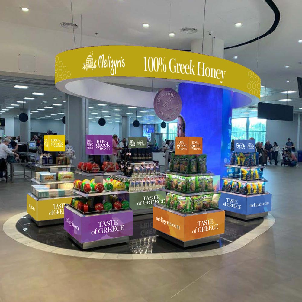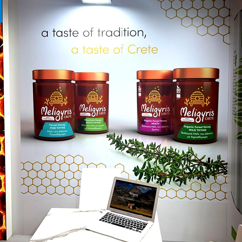 Καταλήξαμε να σχεδιάζουμε τα booth των ελληνικών και διεθνών εκθέσεων που συμμετέχουν, micro stands σε αεροδρόμια και events, όλες τις συσκευασίες, φωτογράφηση των προϊόντων και σιγά σιγά γίναμε και με αυτή την εταιρεία ένα κομμάτι τους.
